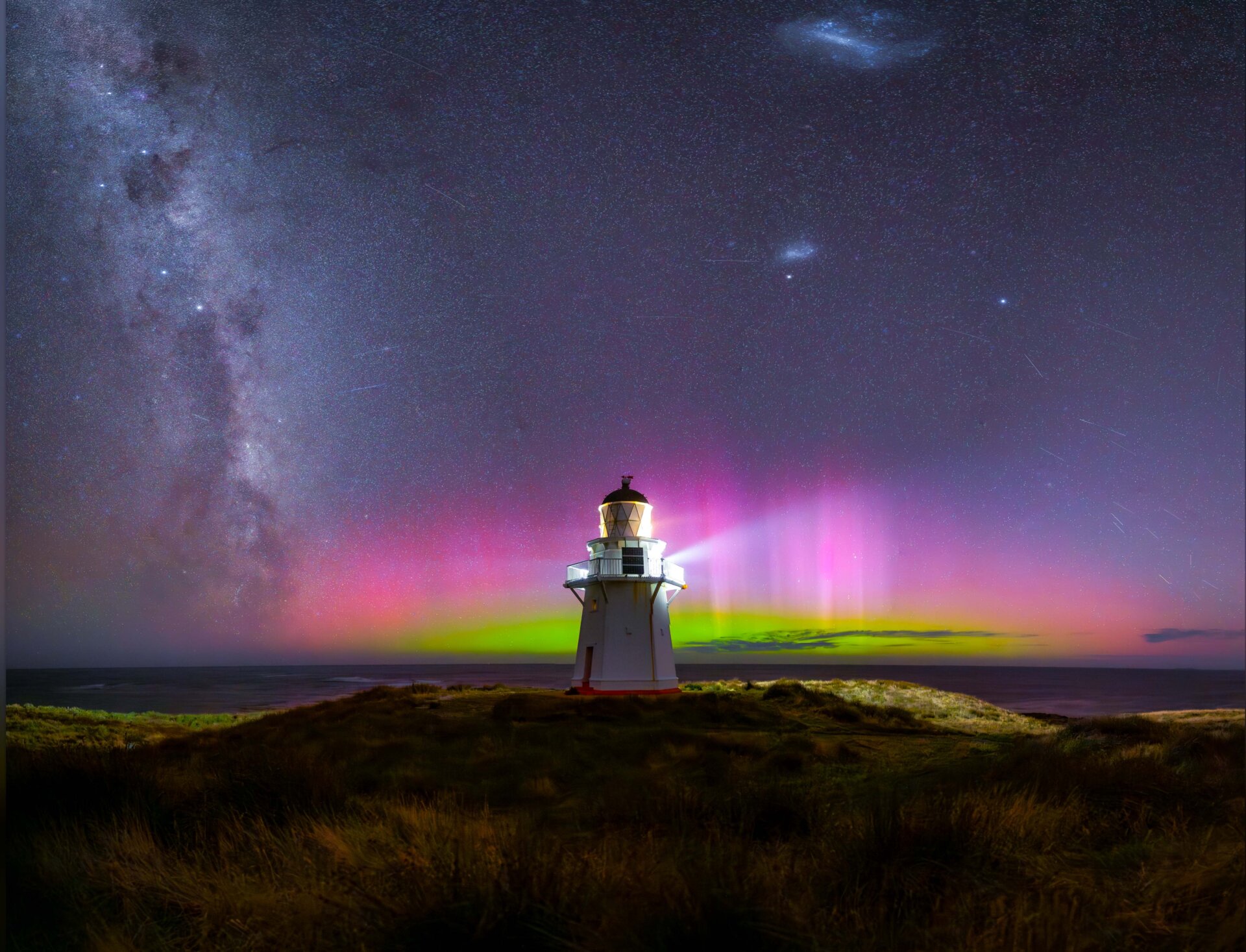 This is a 24 image panorama of Aurora Australis, the milky way and the Magellanic clouds over the Waipapa point lighthouse in Southland New Zealand