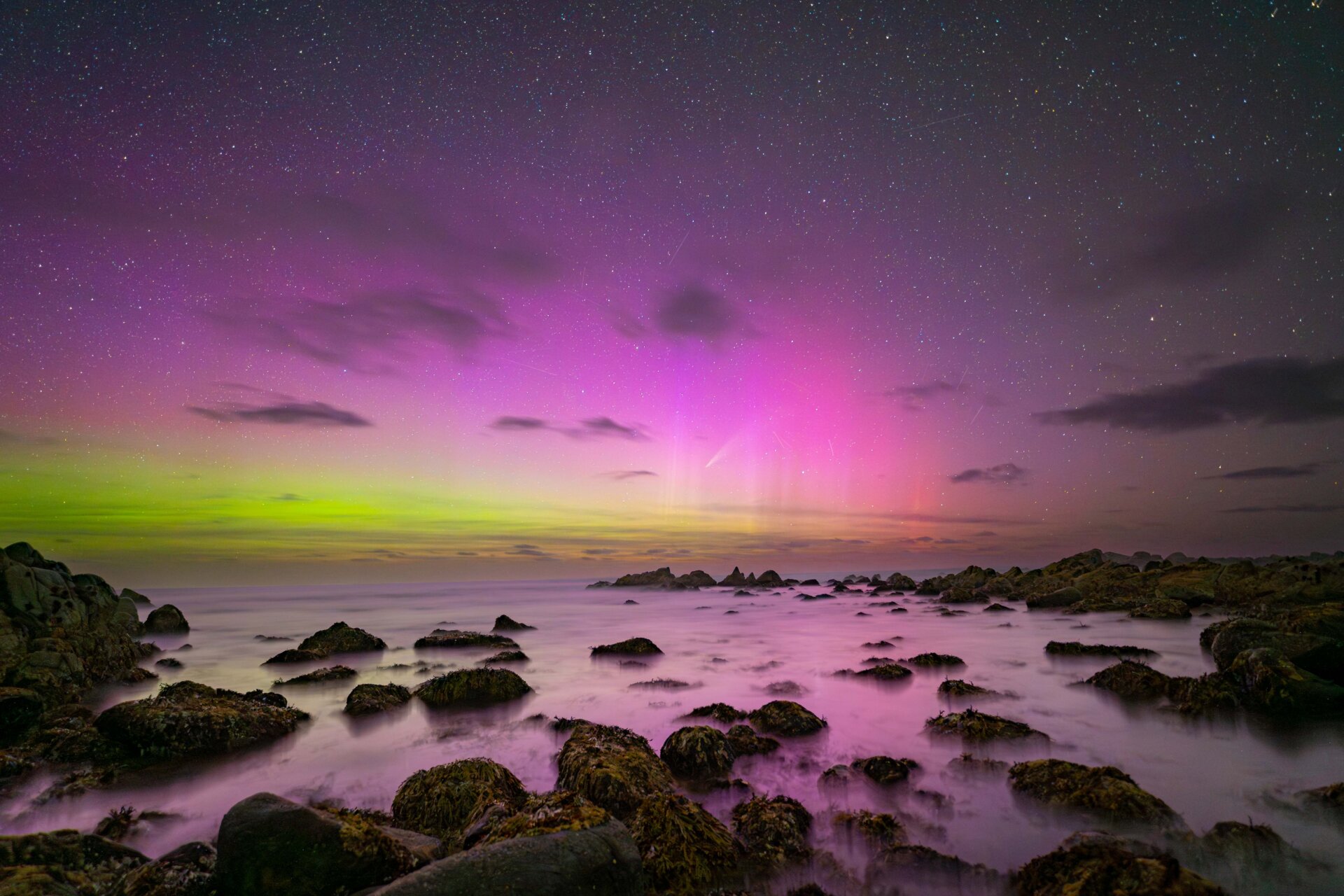 This is a single exposure of comet C/2024 Atlas veiled in rainbow light from Aurora Australis over the southern coast of the South Island at Cosy Nook