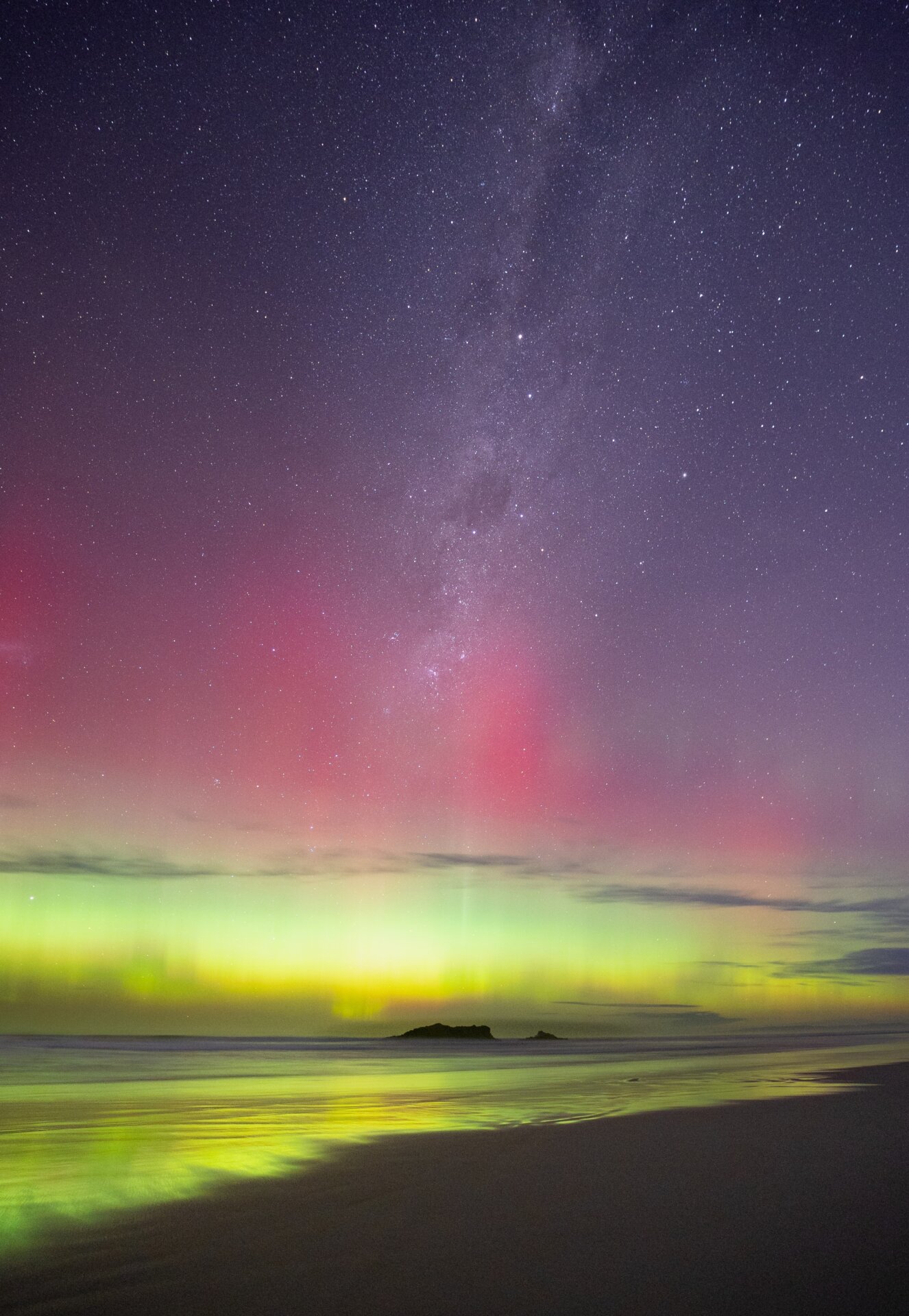 During a three day auroral storm I was able to capture spectacular reflections of the Aurora at Smails beach in Dunedin