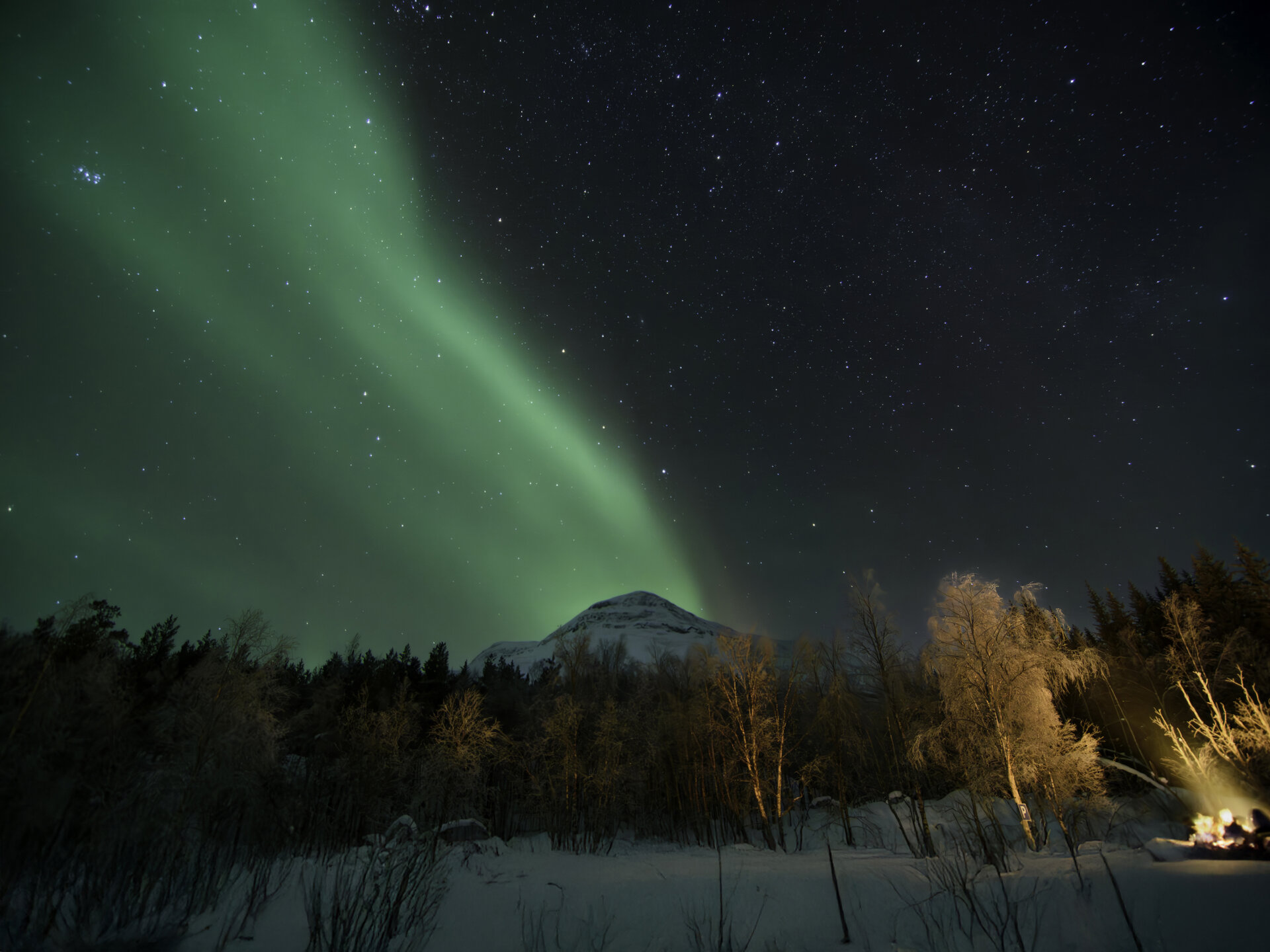 This Image, captured 3 hours south of Tromso next to the Geadggeseatnu River, shows the Northern Lights as they compete against the stars for supremacy in the night sky. The longer exposure time allowed me to capture the lights as a wisp in the sky balanced against the campfire in the foreground with a slight blur in the movement of those gathered around watching the show above.