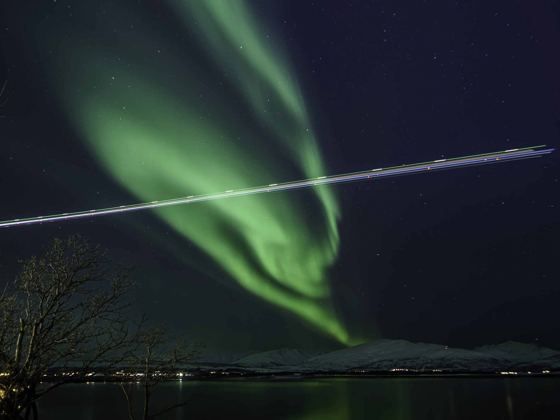 This image captured in the heart of Tromso, shows the juxtaposing journeys of two lights; one ancient, one modern converging under the same stars. The longer exposure time was used to allow the plane to track the full width of the image as it approached its landing, giving the Aurora an ethereal aesthetic.
