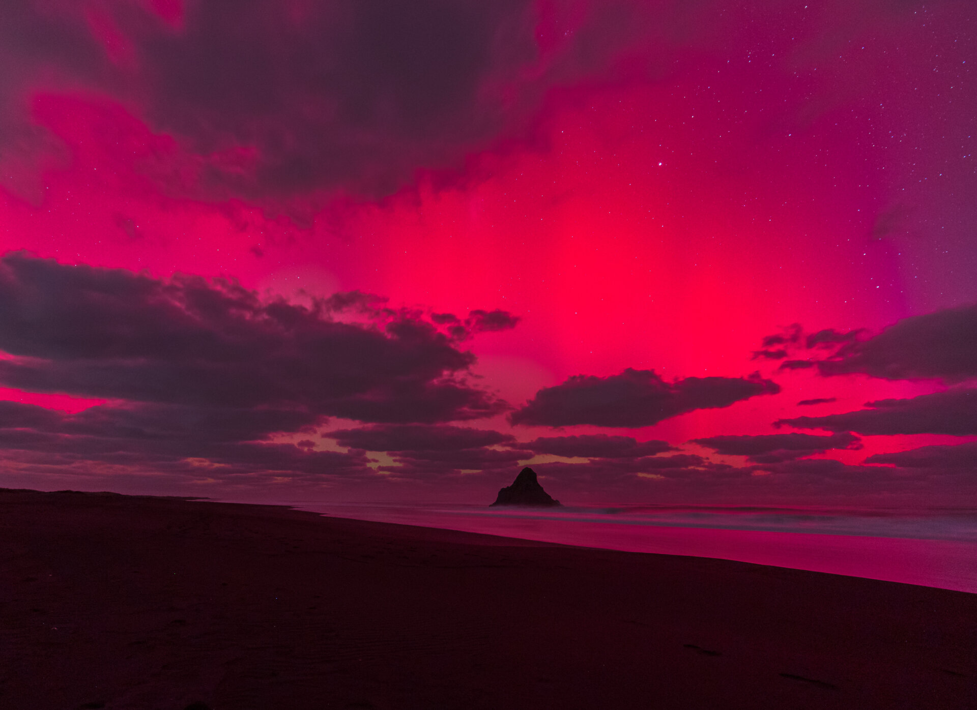 Aurora Australis as seen from Karekare beach in Auckland.