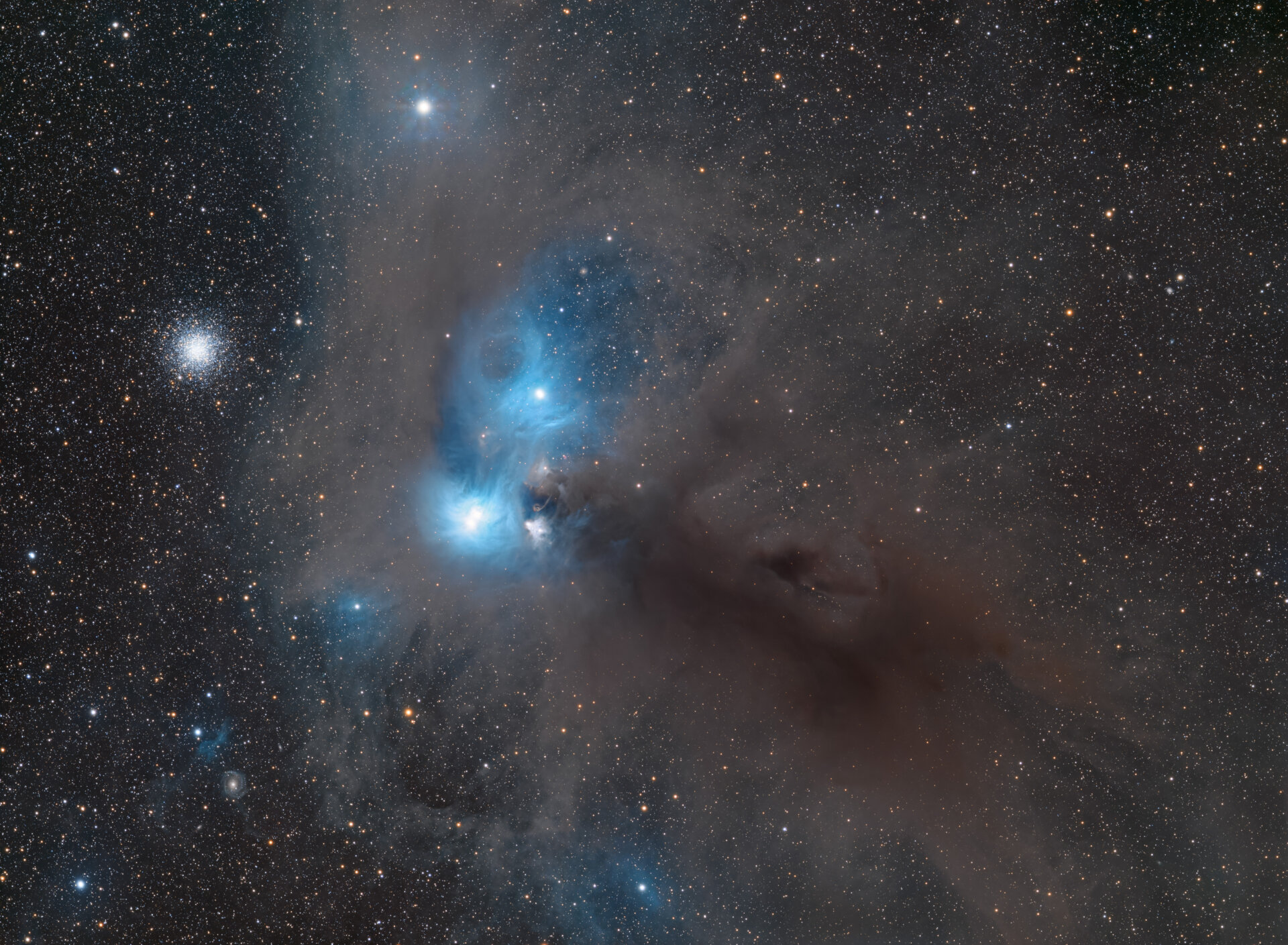 I was able to get a lot of imaging time for this object and the result is undoubtedly my best DSO so far. There's loads going on in this image, and I had a great time researching some of the most prominent objects visible. NGC 6727 is a region of nebulosity within the Corona Australis molecular cloud. Within the bright centre there are multiple reflection nebulae surrounding 4 bright, young stars that have formed within this region, as well as numerous sites of active star formation including Herberg-Haro objects, Young Stellar Objects, and the Coronet Cluster. This is one of the closest star-forming regions to our solar system at just 130 Pc (430 Light-years), around 3.5x nearer than the much more famous Orion Nebula. To the left of the image is the Chandelier Globular Cluster here (NGC 6723). Despite appearing “next to” NGC 6729, it is roughly 70x further away at a distance of 8.7 Kpc (28,000 light-years). With an estimated age of just over 13 billion years, it is one of the oldest star clusters in the Milky Way, however it is clearly visible that many of the stars are blue and white, rather than more orange colours that indicate older populations of stars. This is because this star cluster has an unusually high metallicity, with only 0.4% of the stars coming from the primordial population. In the bottom left we find the face-on spiral galaxy PGC62700, which is classified as an Sb diffuse galaxy. It has a redshift of 0.0178, corresponding to a luminosity distance of around 78 Mpc (250 Million light-years), and the supermassive black hole within is a candidate for an active galactic nucleus (AGN)