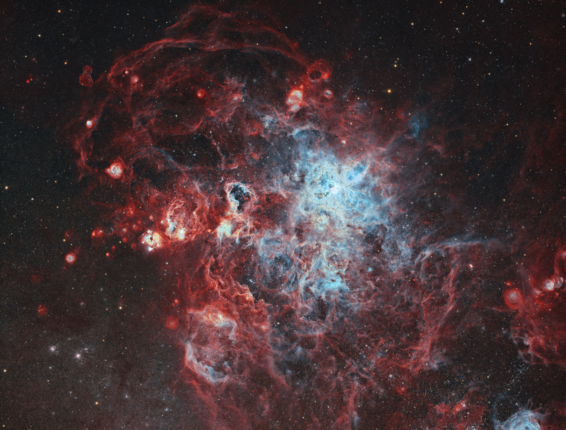 The Tarantula Nebula is undoubtedly one of the best objects in the night sky, visually, photographically, and scientifically. Situated roughly 49Kpc (160,000 Ly) from Earth, this HII region is not within our own Galaxy, but rather the Large Magellanic Cloud (LMC), a dwarf galaxy which is the closest significant neighbour to the Milky Way. It is the most active know star forming region within the local group of galaxies, and is thought to contain almost 1 million stars and protostars that have formed within it. This is explained by the Nebula’s position at the leading edge of the LMC; As the LMC travels through the intergalactic medium, it experiences a force called ram pressure which compresses the inter-stellar medium within the galaxy,resulting in a very high rate of star formation. It is possible that the Tarantula Nebula is also fed with gas stripped from the Small Magellanic Cloud, another dwarf galaxy that orbits the LMC.