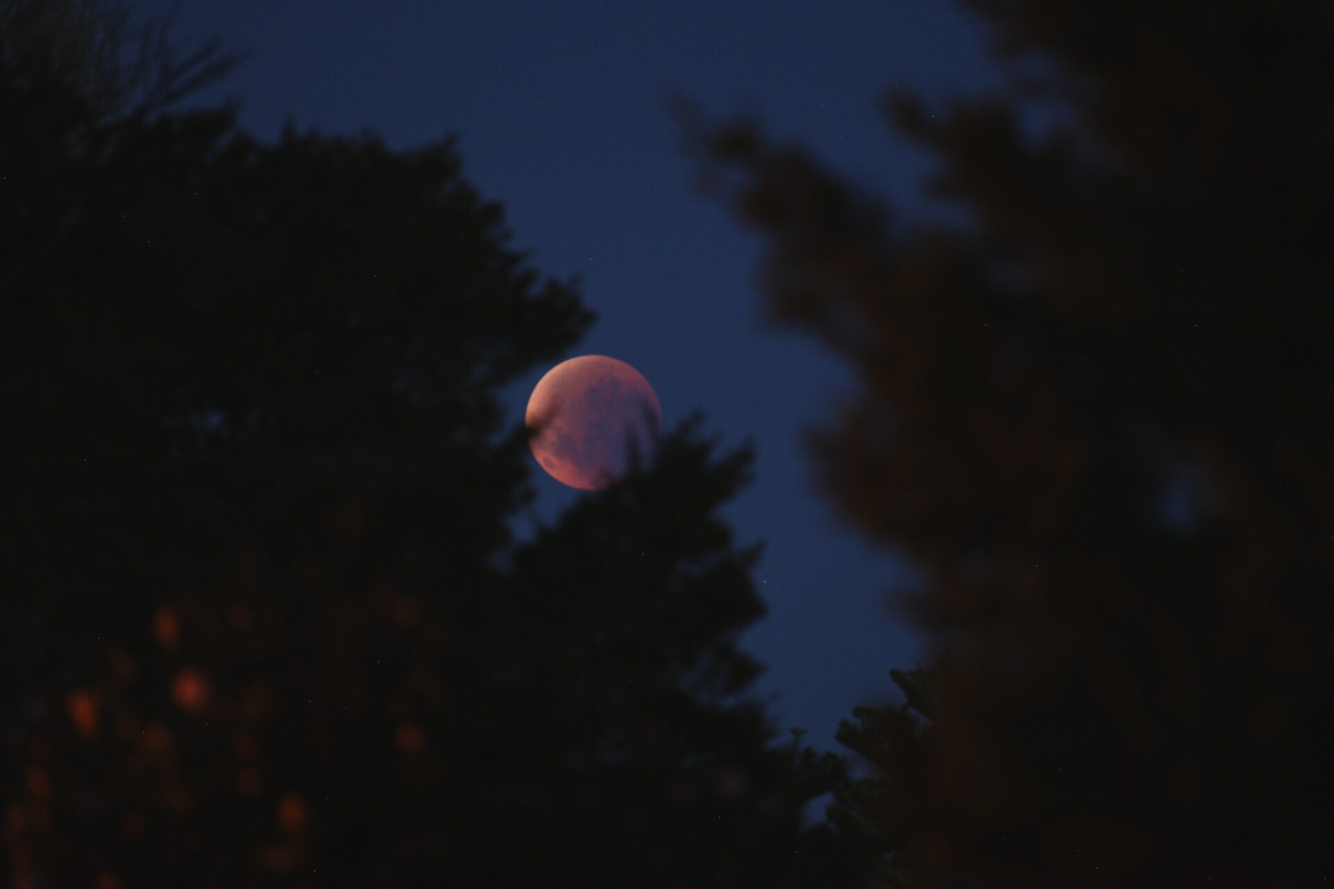 The last of the lunar eclipse hiding in the bushes before disappearing as the dawn broke.