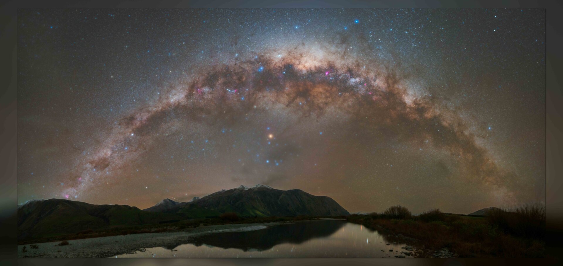 This is a 30 image panorama using a move shoot move nomad tracker, a Halpha modified a6300 and viltrox 15mm f1.7 lens, this was my first ever attempt at a milky way arch panorama with a star tracker of the milky way over the Rakaia river and mountains