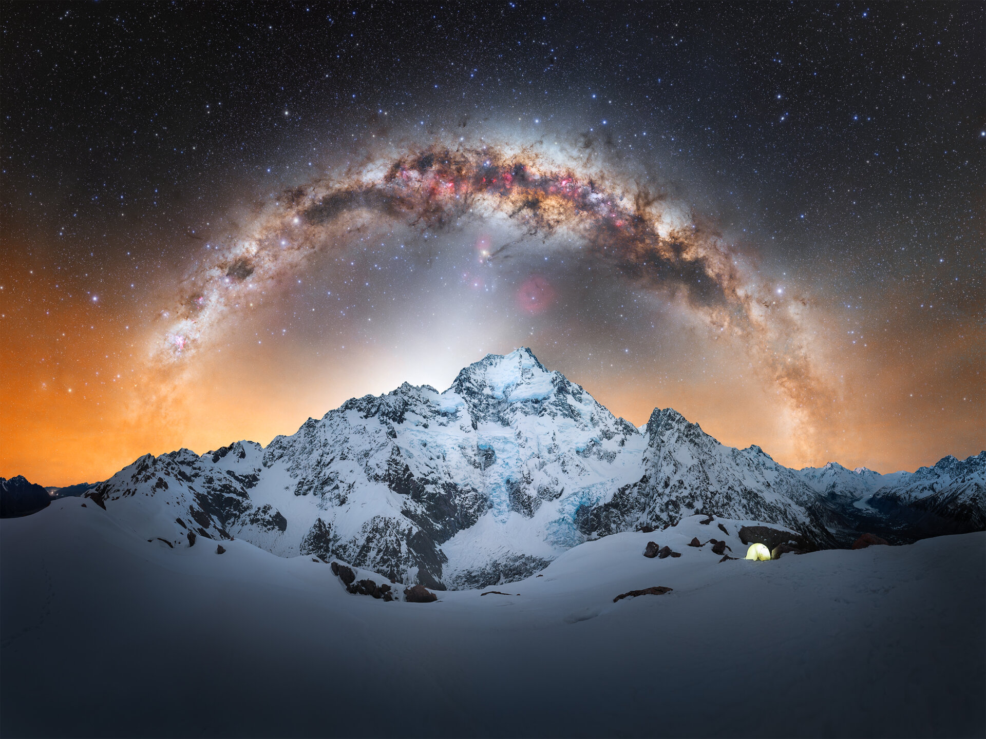 I’m showcasing the west Milky Way arch over Aoraki Mt Cook, one of the most challenging astro-landscape shots undertaken in NZ. The west arch can only be taken from the Tasman Valley during winter or early spring. I undertook a solo adventure into the valley and up into the high mountains under winter conditions to capture this image. This is my dream shot as it incorporates mountaineering, Astro photography, and the ultimate challenge of capturing the west Milky Way arch over Aoraki Mt Cook. The route compassed traversing around frozen hillside cliffs, travelling up ridge lines, scree slopes, and snow slopes with axes and crampons. Having a unique skill set of mountaineering and astrophotography, I was able to capture the full arch over Aoraki, possibly the first of its kind without the use of a helicopter.