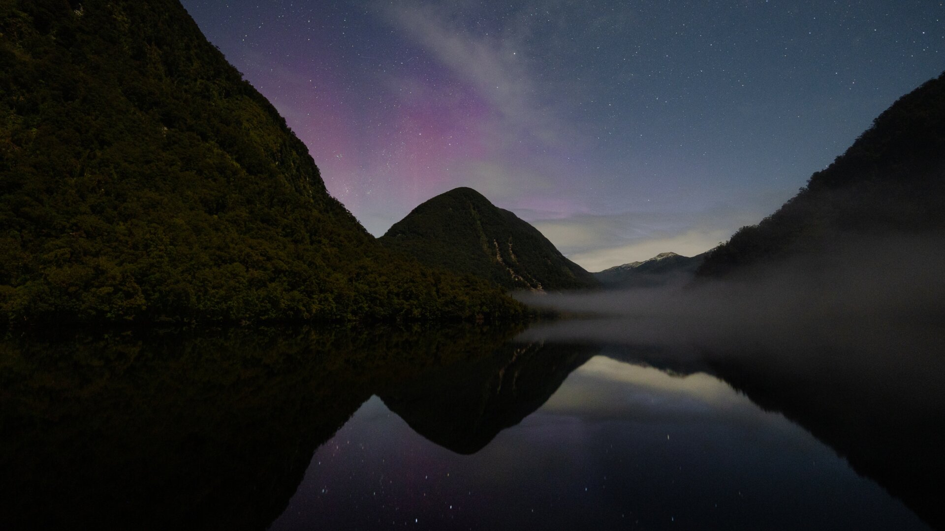 While on an overnight trip on the Milford wanderer we had news of a potential aurora that evening, once we anchored up within doubtful sound I made my way to the deck, having to take a short photo due to the ships movement I was able to capture the aurora peaking over the mountains with the perfect reflection of the ocean and the dense fog rolling in
