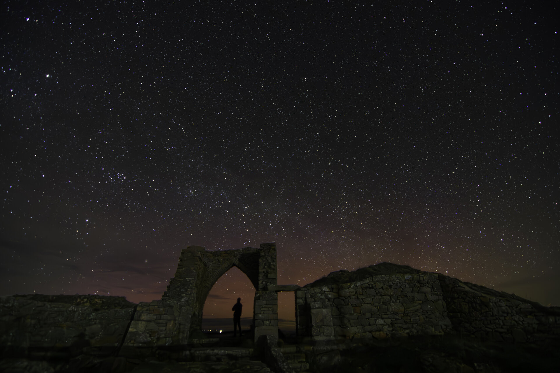 This image was captured on the North West coast of Jersey, UK. The Northern Lights can be seen as a soft orange hue due to the long exposure time. Clearly visible is the vast expanse of the night sky, with an observer caught awe struck.