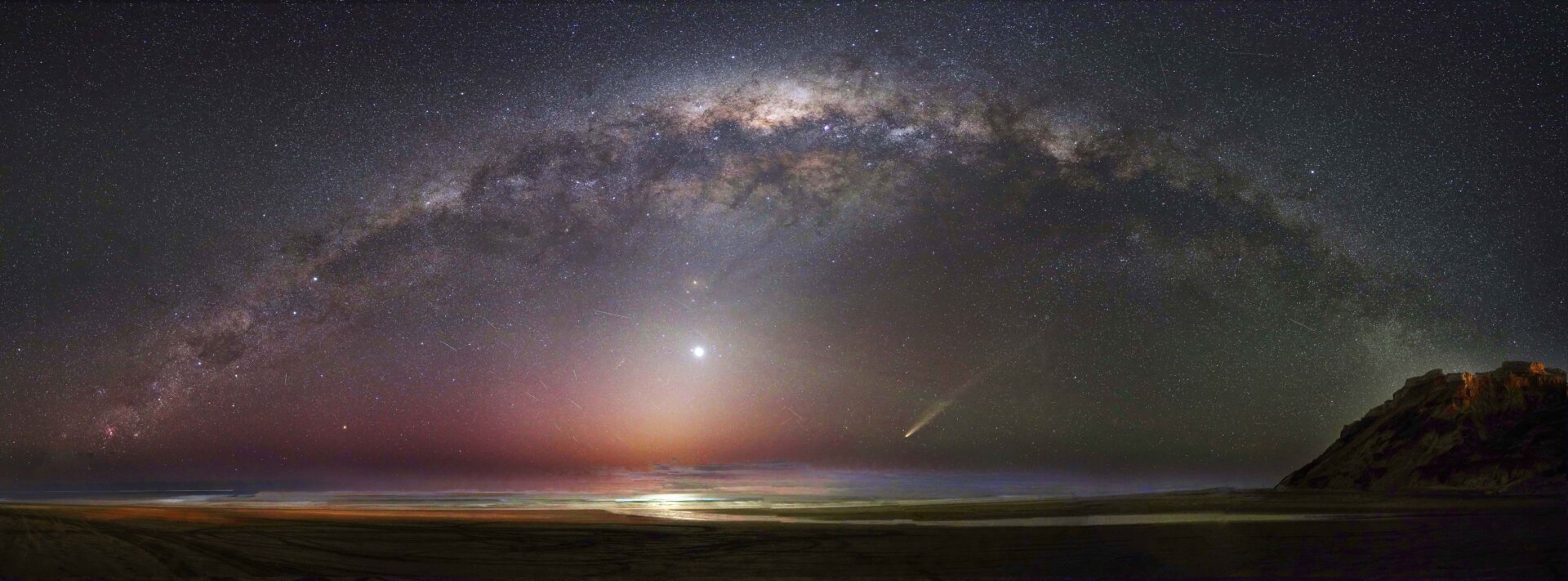 Milky Way Panorama with setting Comet Atlas Tsuchinsan, Venus, and Zodiac Light, and some Auroralike Skyglow