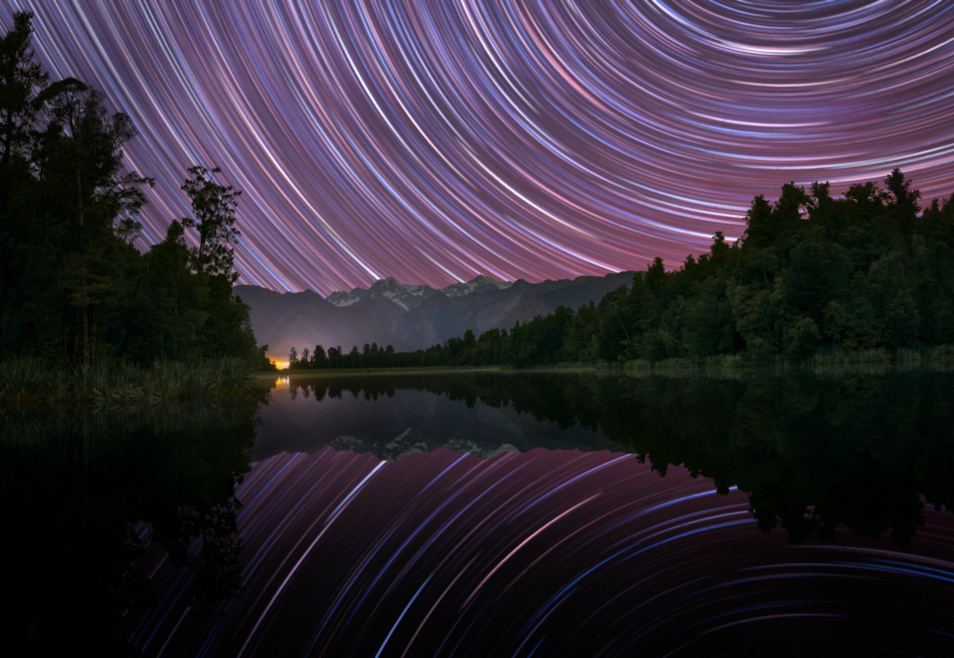 Lake Matheson is renowned for its natural beauty and pristine reflections. It was the perfect night to shoot here. When I finished stacking all my images, I was amazed to see that the lake hadn’t moved an inch, resulting in a flawless star trail reflection.