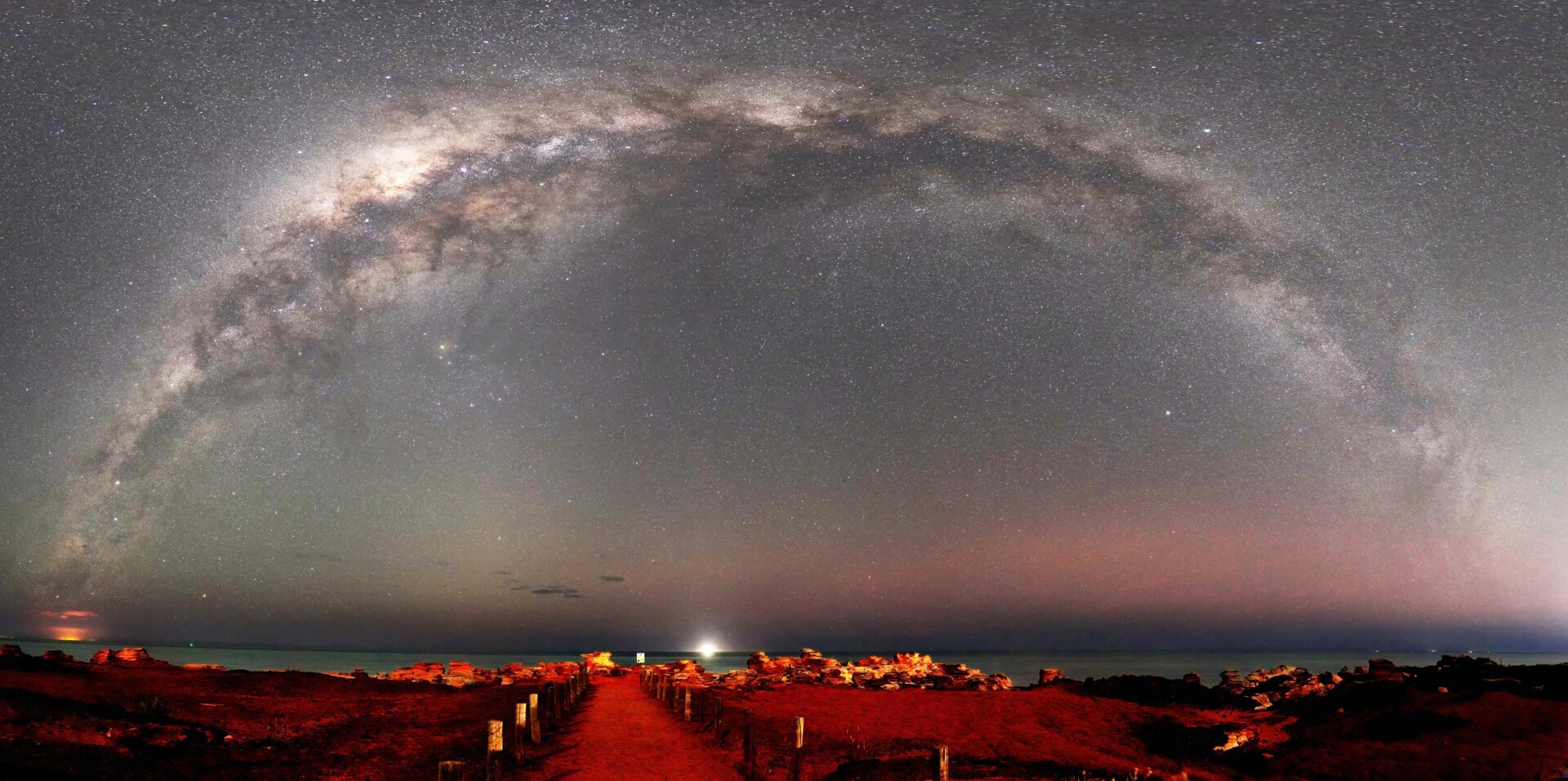 Panorama of the Milky Way at Gantheaume Pt. near Broome in the so-called Red Country, above the steep Rocks at sea after passing the Light House. At the left end, some colours of the soon-rising moon are to be seen. At the bottom of the Rocks, after a steep climb, Dinosaur Footprints can be found